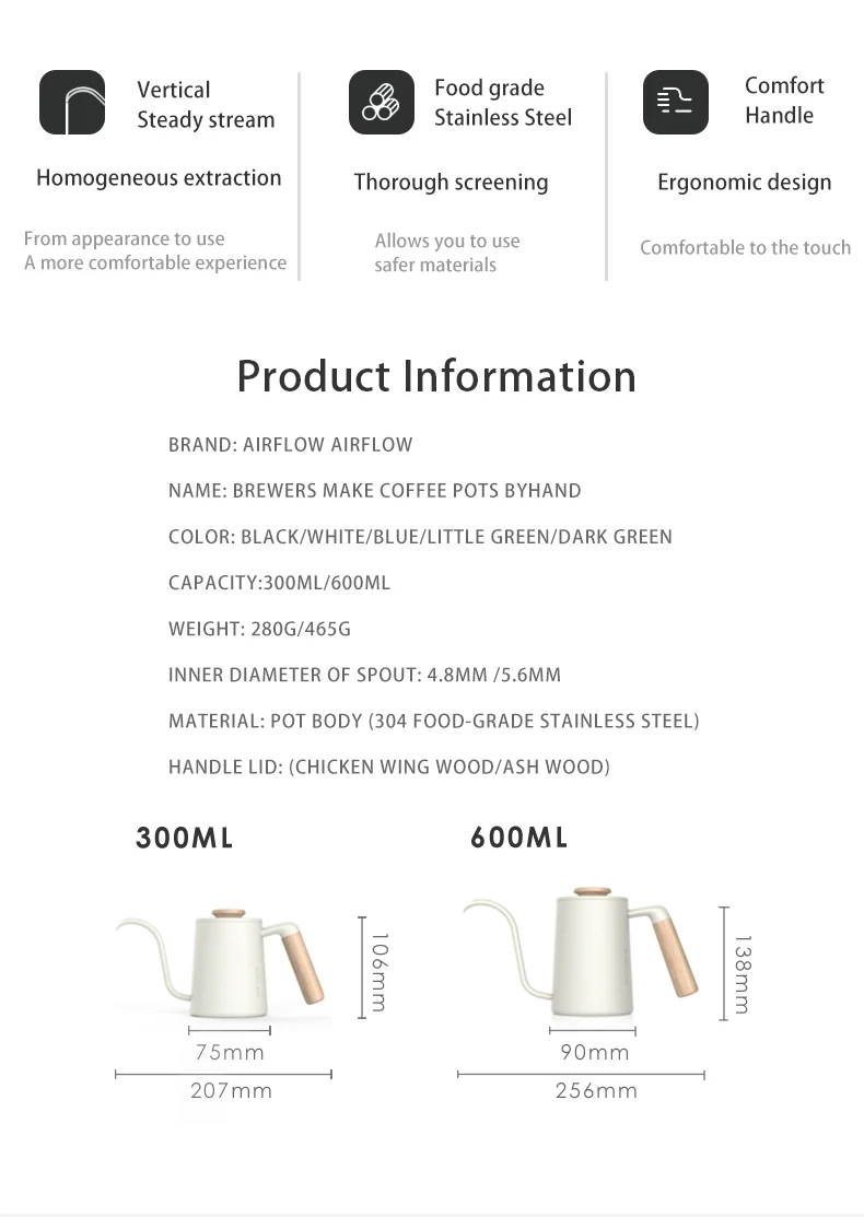 AIRFLOW Pour Over Coffee Kettle 300ml 600ml Stainless Steel Gooseneck Pot Home Barista Coffee Accessories