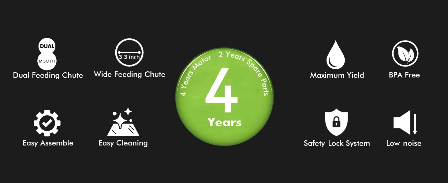 【Kid-Friendly and Easy to Clean】Our juicer operates quietly and is made from BPA-Free materials. A double safety system ensures your safety. All removable parts are dishwasher-safe and can be easily cleaned with warm soapy water.